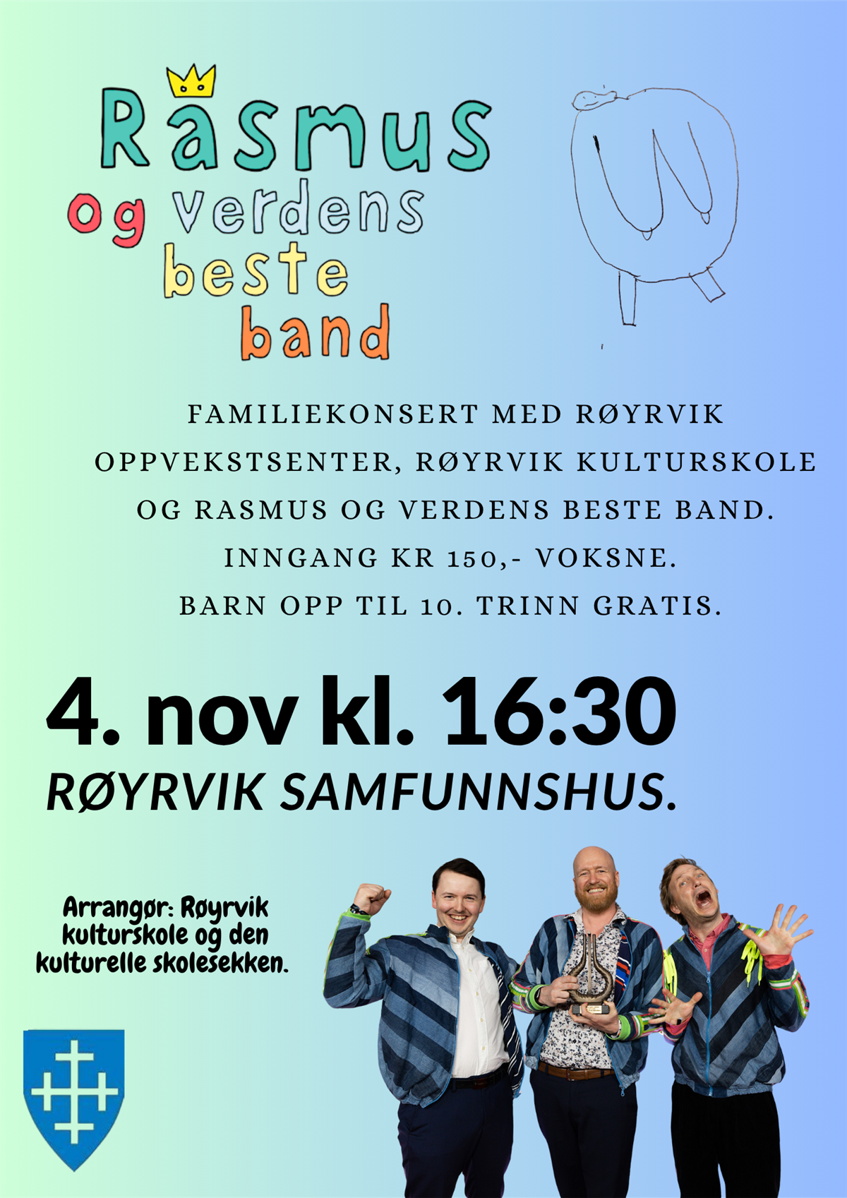 Familiekonsert med Rasmus og verdens beste band Tirsdag 4. november kl. 16:30Elever fra Røyrvik oppvekstsenter og Røyrvik kulturskole spiller familiekonsert med Rasmus og verdens beste band tirsdag klokken 16:30 på Røyrvik samfunnshus. Inngang fra videregående og opp 150 kr. Barn opp til 10. trinn gratis. Sist endret 03.11.2025 14.25