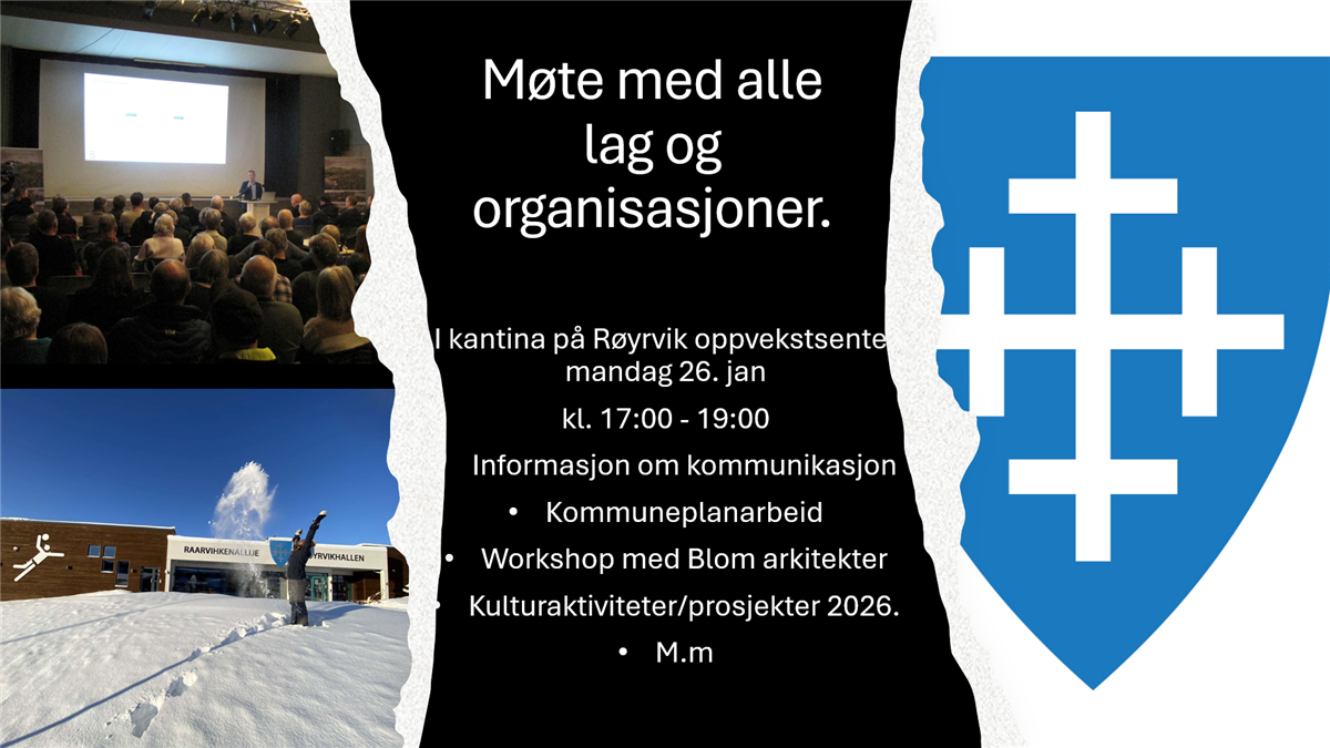 Møte med alle lag og organisasjoner i Røyrvik kommuneMøte med alle lag og organisasjoner i Røyrvik kommune mandag 26. januar klokken 17:00 i kantina på Røyrvik oppvekstsenter. Vel møtt Sist endret 09.02.2026 12.34