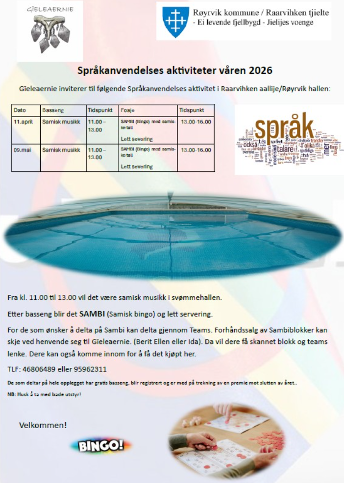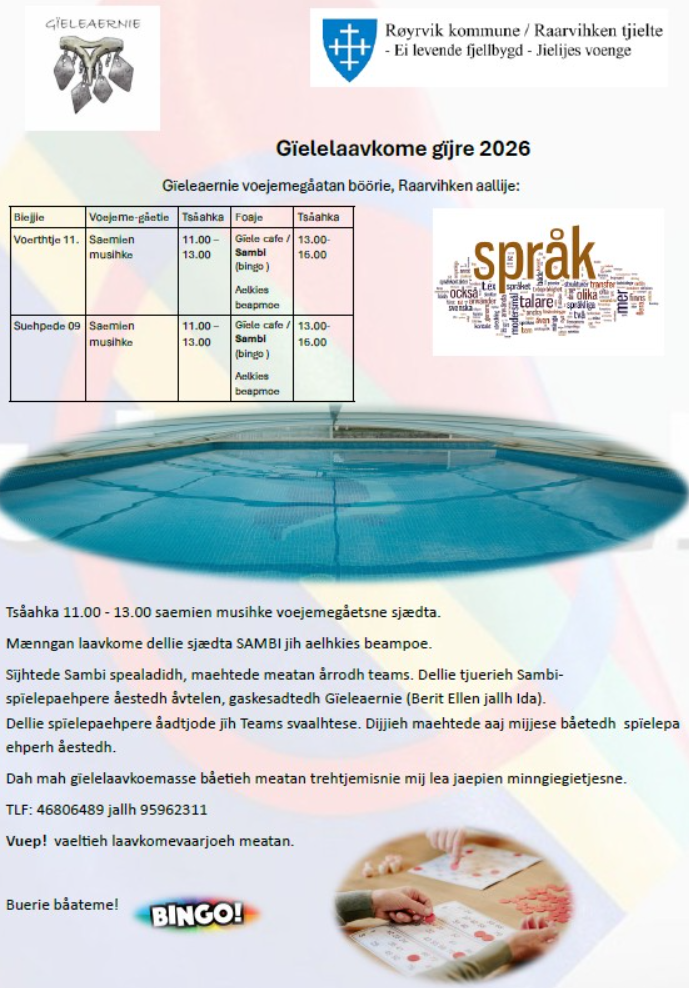 Språkanvendelse våren 2026 / Gïelelaavkome gïjre 2026OBS! 11/4 blir det ikke bingo. Bad med samisk musikk kl 11-13Lett måltid kl 13-14 Sist endret 09.04.2026 10.53